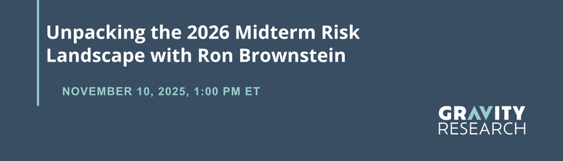 Luke Hartig, President of Gravity Research, and Ron Brownstein, Senior Political Analyst for CNN and columnist for Bloomberg Opinion, convened for a forward-looking discussion on the road to 2026 — exploring how evolving campaign issues and voter dynamics intersect with corporate risk. The session unpacked: